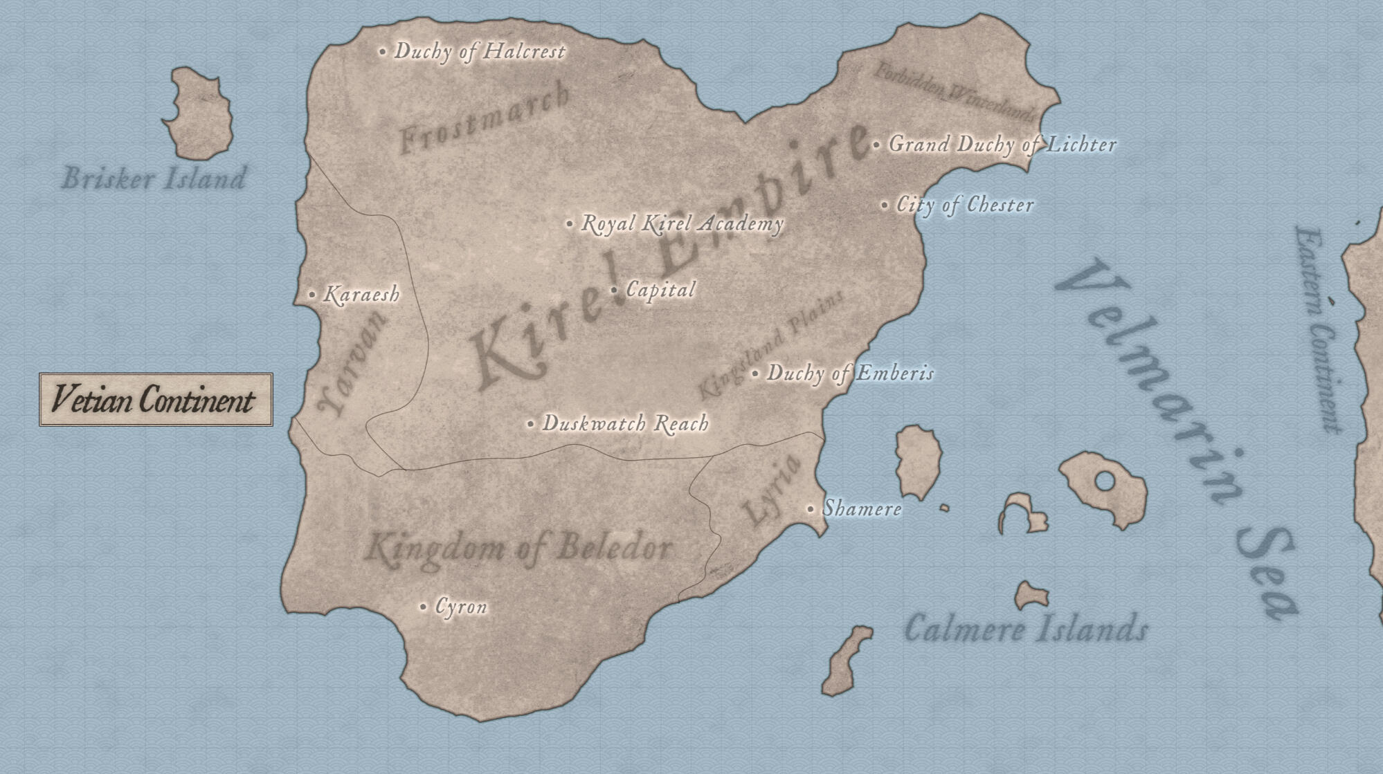 The Kirel Empire, once a modest kingdom led by an ambitious monarch and bound to an ancient, enigmatic source of magic, has grown into the largest and most formidable nation on the Vetian continent. Its territories stretch from the frozen reaches of the northwest, where the stoic Halcrest Duchy guards the Frostmarch, to the sun-warmed southeast, home to the fertile Kingsland Plains ruled by House Emberis. In the northeast lies the mysterious Lichter Duchy, veiled in secrets and old blood, while at the heart of it all stands the imperial capital — a sprawling seat of power where the royal family reigns unchallenged.Spanning a multitude of climates and landscapes, the empire is as diverse in terrain as it is in its internal politics. Beneath its polished grandeur simmer the ever-shifting tensions and rivalries of the royal bloodline, whose hidden agendas shape much of the empire’s fate. Despite its internal strife, the Kirel Empire maintains a facade of diplomacy, fostering trade and tentative peace with the smaller neighboring realms. Yet, its history is anything but gentle — for it was this empire that played a pivotal role in the cataclysmic fall of the dragons over a millennium ago, a legacy that still commands fear and reverence across the continent.